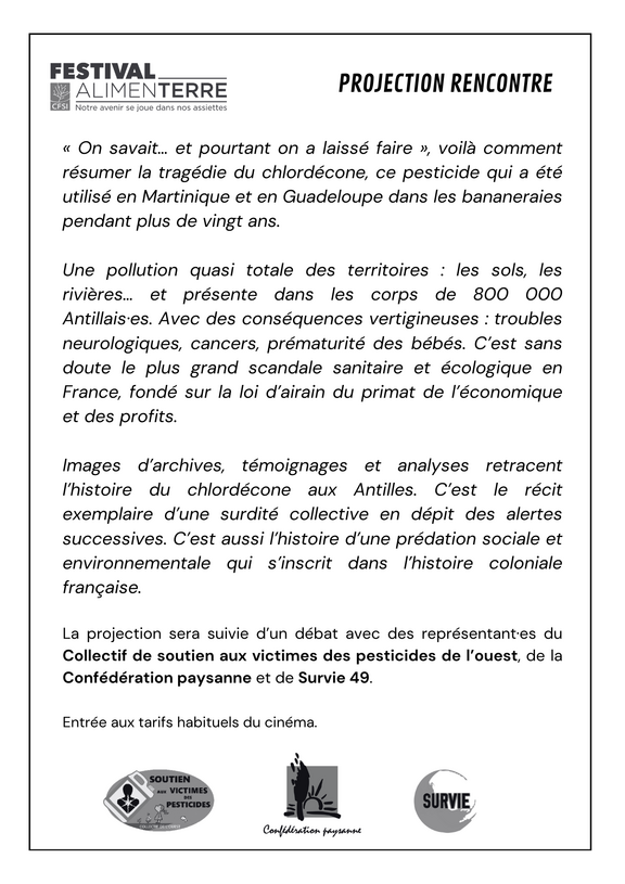 Cette soirée est organisée dans le cadre du festival AlimenTerre, par les associations: Survie49, la Confédération paysanne et le collectif de soutien aux victimes des pesticides de l'Ouest Groupe 49.
