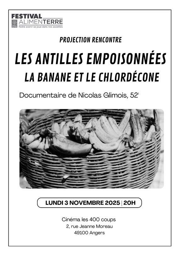 Nous vous invitons à une projection suivie d'un débat sur les Antilles et le Chlordécone au cinéma les 400 coups (Angers), le lundi 3 novembre à 20h.